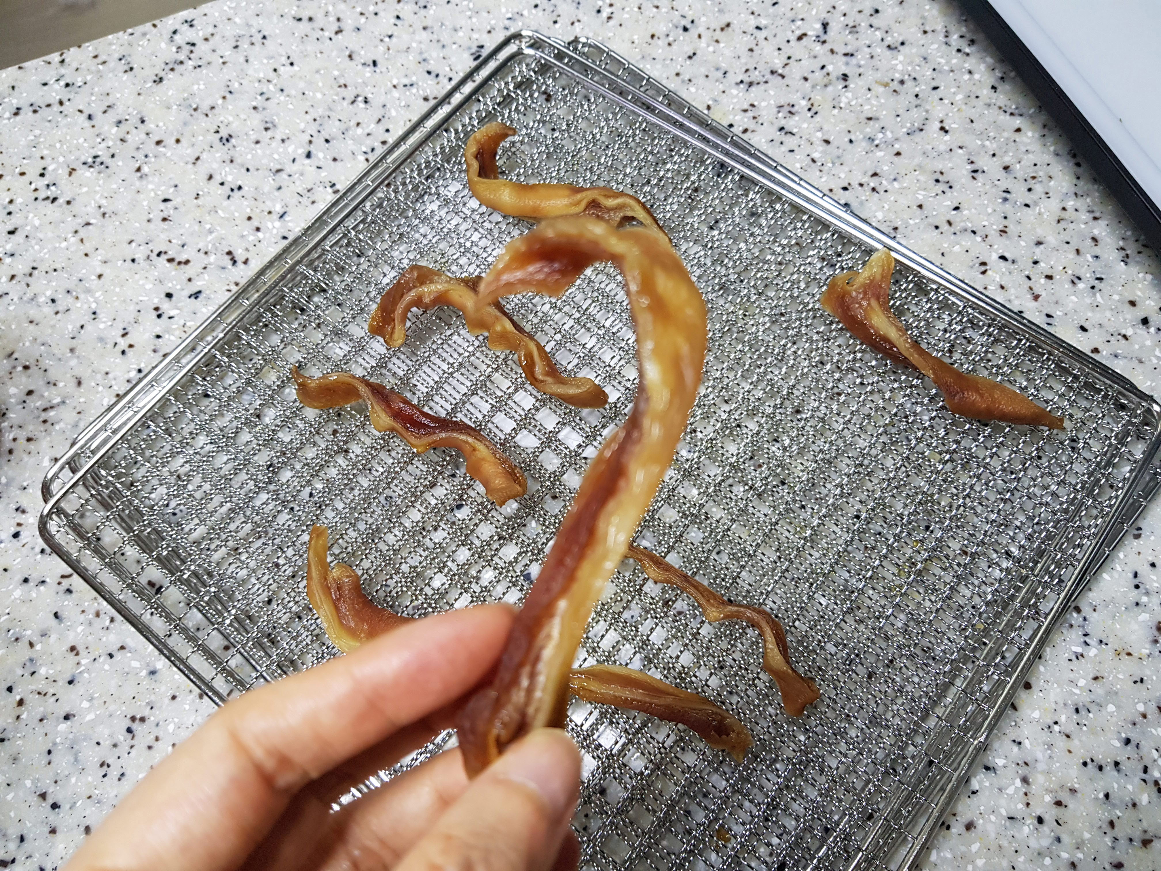 건조하면서 기름이 빠지고 수분이 날아가는데 많이 줄어드니 너무 얇게 자르기보다는 조금 크게 자르는 것도 괜찮다.