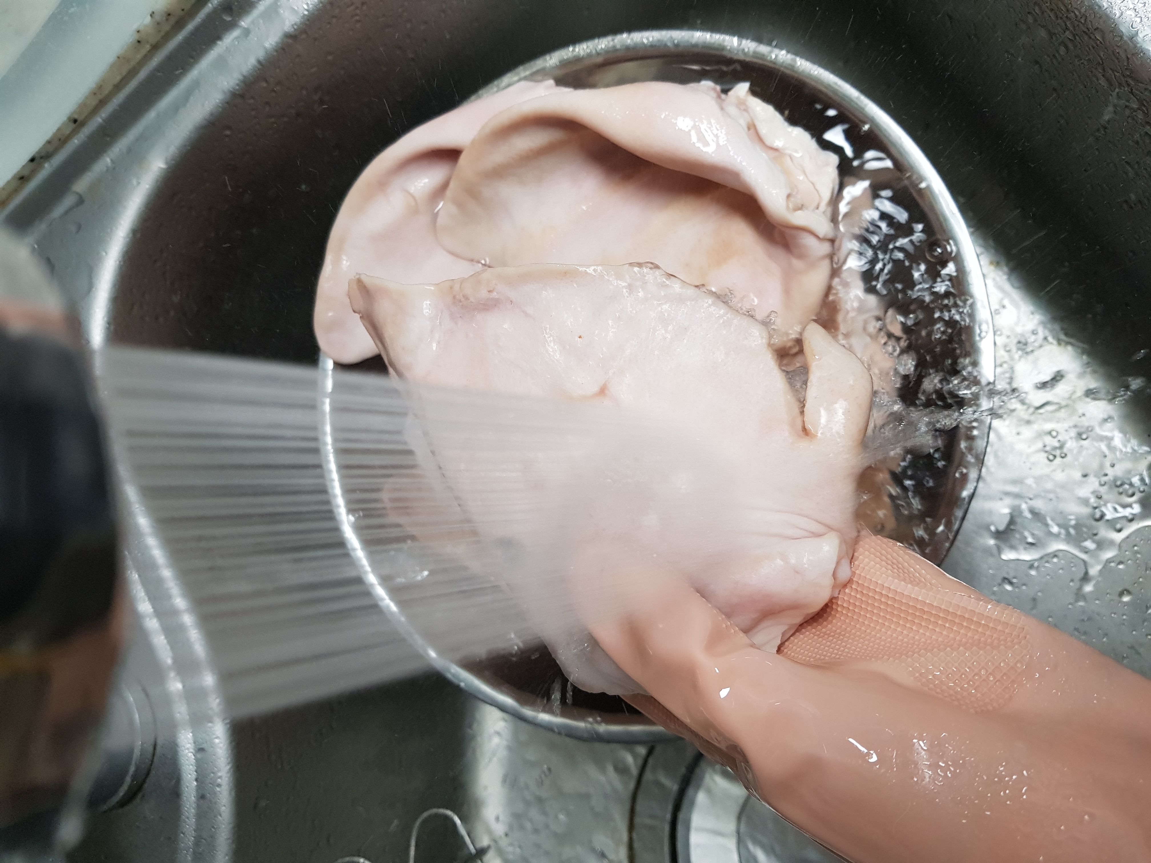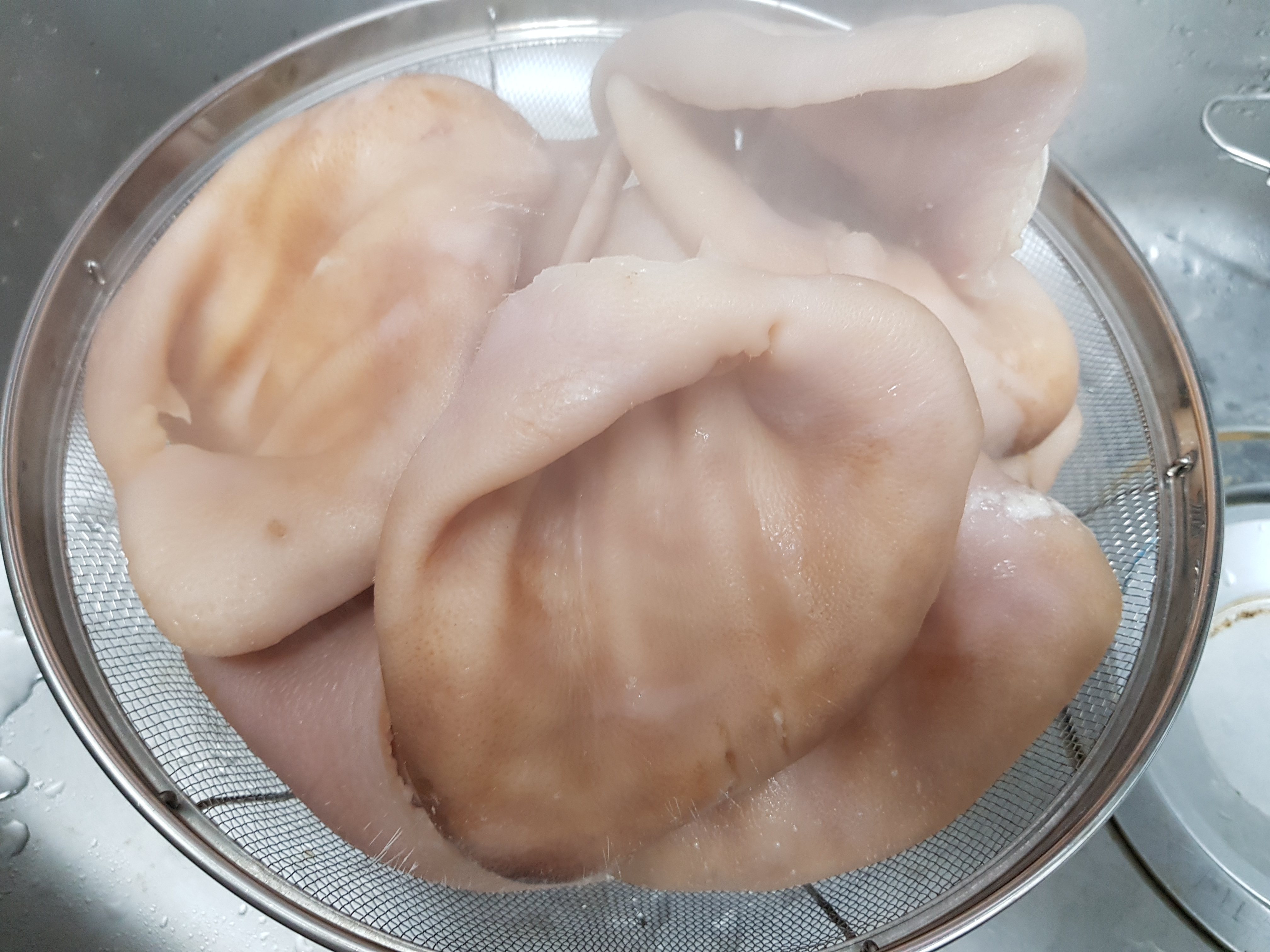 4) 삶아낸 돼지 귀를 건져 흐르는 물에서 깨끗이 씻어준다.