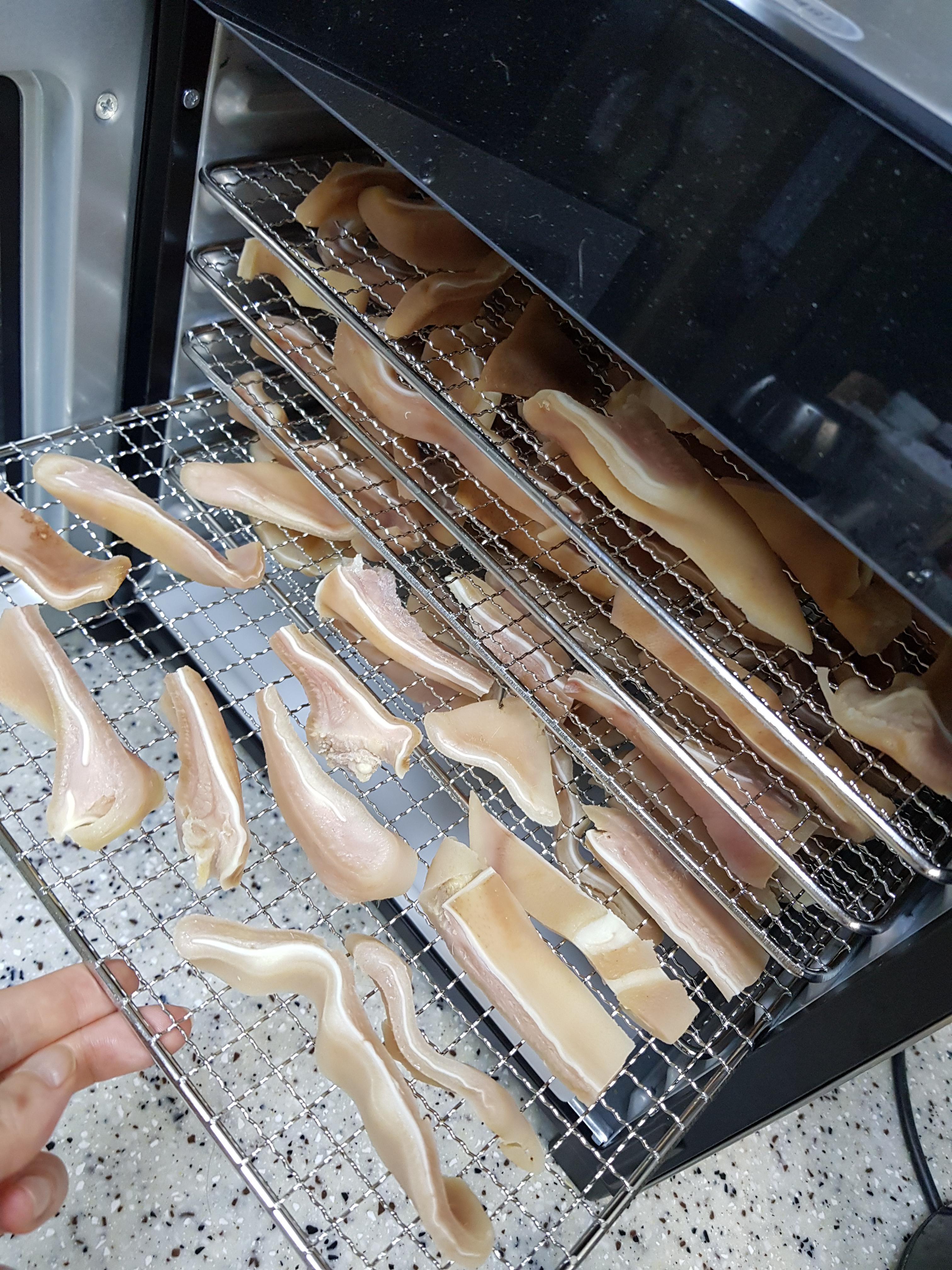 딱딱한 개껌용으로 사용할 목적이기에 높은 온도에서 건조하게 된다.